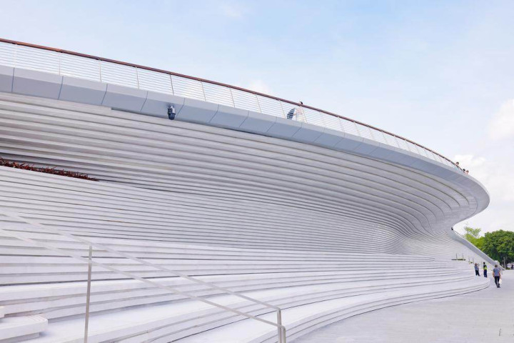 此次改造通过调整整体台阶形态,继续延续广州塔涟漪曲线,避让堤防8米控制线范围拓宽台阶,打造一凸一凹中轴眺台及滨水剧场空间,利用出挑观景台形成遮阳的室外观景空间,同时也与城市中轴线更加呼应对称。新建成的平台由大悬挑平台、大台阶平台和两侧坡道组成,结构总长度约230米。其中大悬挑平台面积约为1100平方米,东西跨度约为75米,南北跨度约为20米。