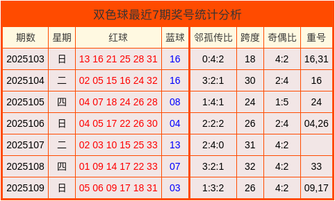 上期开奖数据中得知邻孤传比为1:3:2,奇偶比为4:2,开出2枚重号09,17,跨度数据为26。