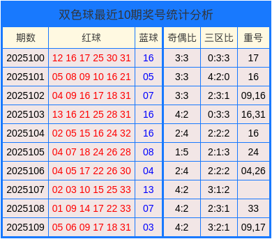 开奖回顾:双色球第2025109期奖号:05、06、09、17、18、31+03。其中奇偶比为4:2,三区比为3:2:1,开出2枚重号09,17。