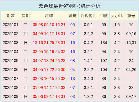 上期开奖数据中得知邻孤传比为1:3:2,大小比为3:3,开出2枚重号09,17,和值数据为86。