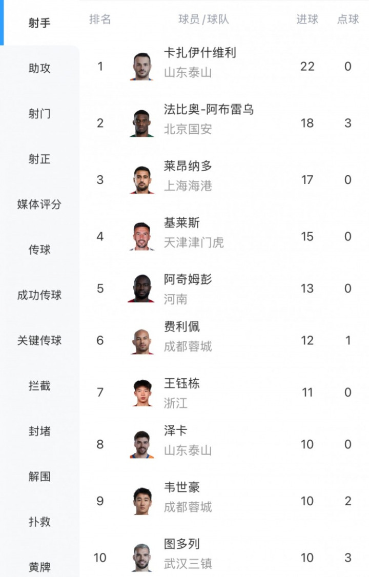直播吧9月22日讯中超第25轮昨晚结束,射手榜方面,瓦科22球领跑,对阵国安戴帽的莱昂纳多17球升至第三,法比奥18球第二。