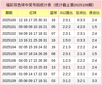 红球三区比3:2:1,质合比为3:3,012路比为3:1:2,蓝球为质数、0路号码。